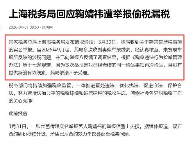 可是反转来得很疾,税务部分随后回应,此前已众次核查相似线索,未觉察涉税题目,此次举报因无新线索依法不予受理。