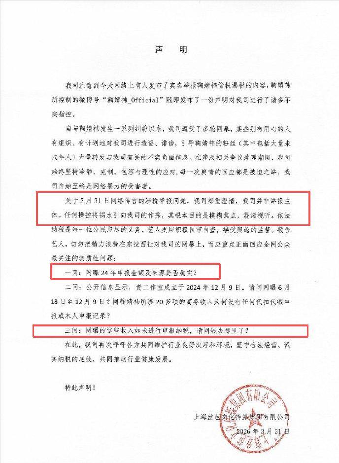 声明艺人依法征税、踊跃配合核查,并指控对方恶意独霸言论、诬蔑商誉,已通过执法途径维权。